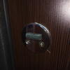 Глазок из пластика и был поцарапан после первой распаковки.В него ничего не разглядеть.
