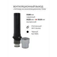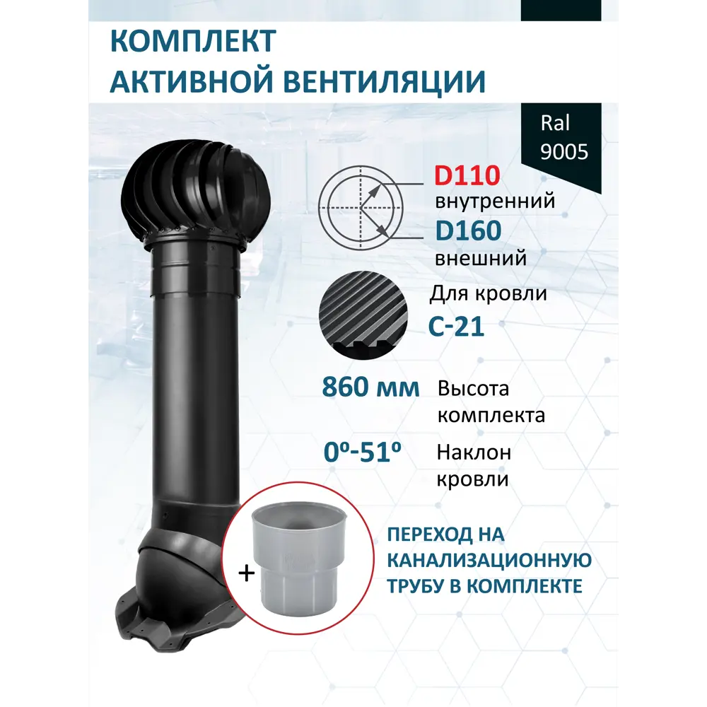 Комплект активной вентиляции: Турбодефлектор TD160, вент. выход утепленный высотой Н-700 с переходом D110, для кровельного профнастила С-21 мм - служит для увеличения тяги в вентиляционном канале частного или многоквартирного дома, в погребе, гараже, курятнике, коровнике, конюшне, предбаннике, в парилке бани, внешней вентиляции септика и складских помещениях. Состоит из: VV160 -700 - Вентиляционный выход изолированный высотой 700 мм, внутренний диаметр 125 мм, наружный 160 мм. Применяется для обеспечения проветривания канализационной системы или для удаления всех запахов и паров, образующихся при приготовлении пищи (кухонная вытяжка). Укомплектован утеплителем из пенополиуретана, предотвращающего образование конденсата. Благодаря использованию инновационных материалов, вентиляционный выход не подвержен оледенению даже во время длительных морозов. Рекомендуем устанавливать на кровлях с круглогодичным проживанием. Имеет снизу посадочную юбку на проходной элемент и сверху резьбу для фиксации колпака. Имеет в комплекте саморезы для фиксации к проходному элементу. PRX110 - Переход на канализационную трубу Д110 с вент. выхода 125/160. PF21 - Проходной элемент для вентиляции PROF-21 применяется на кровлях из профильного листа С-21 для установки вентиляционных труб. Проходной элемент для вентиляции PROF-21 имеет снизу бутил-каучуковый уплотнитель с липкой основой. Принципы монтажа и эксплуатации изделия:; При помощи лекала в кровле вырезается вент. отверстие; Проходной элемент устанавливается сверху вырезанного отверстия, после чего фиксируется саморезами к кровле; На проходной элемент устанавливается вент. выход. Материал: Полипропилен Размеры (дшв): 330х260х160мм Размеры нижнего посадочного отверстия 230;165мм TD160 - Турбодефлектор D160 из оцинкованного окрашенного металла состоит из активной головки с лопастями, установленной на основание с помощью подшипников, которая вращается под действием ветра, удаляя воздух из вентиляционного канала. Ветер является ""двигателем"". Предотвращает обратную тягу. Все детали сделаны из лёгкого металла, поэтому, чтобы турбина начала работать, достаточно самого слабого ветра. Внимание! Цвет комплекта может отличаться от фото, также части комплекта могут иметь разный цветовой оттенок в пределах заявленного цвета. Для исключения протекания крыши с этим товаром рекомендуем дополнительно приобрести Гидрозатвор кровельный, черный - Артикул: GZ, и герметик для кровли. Кольцо гидрозатвора предотвращает попадание влаги в утеплитель при проходе элементов вентиляции через пирог утепления.