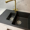 Прямоугольная мойка с двумя чашами и крылом. Глубина большой – 200 мм. Удобно мыть габаритную посуду. Малая чаша для размораживания продуктов, мойки овощей и фруктов. Маленький угол наклона стенок сохраняет объем. Модель оборачиваемая.